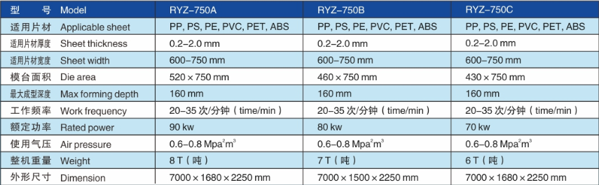 RYZ-750 Series of Full-automatic Hydraulic CUP-making Machine developed by our company is a fully automatic plastic container’s forming machine which features in high speed and high efficiency. This machine is applicable to the production of plastic sheet material, such as PS, PP, PVC, PET and ABS.